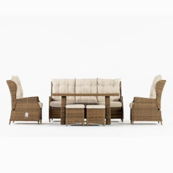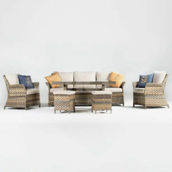 Glasgow koltuk takımında; rattan oturma grubuna cam tabanlı dikdörtgen masa eşlik ediyor. Üçlü rattan koltuk, 2 adet tekli koltuk ve yine 2 adet puf ile destekleniyor. Bej renk tercih edilen model, şık ve zarif tasarımı ile beğeni topluyor. Alüminyum gövde üzerinde kullanılan elektrostatik boya, kalıcı bir kullanım sağlıyor. Uzun yıllar kullanılabilen model; kara, yağmura, dona ve benzer iklim koşullarına karşı dayanıklı. Güneş ışınlarına karşı da dirençli olan model, açık alan kullanımında renklerini koruyor. Hava alabilen oturma takımı, yakma ya da terleme yapmıyor.